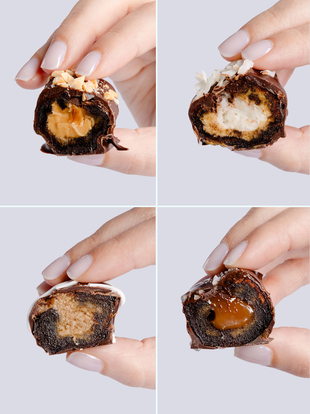 Base Ingredients: Medjool date; Peanut Butter Filling (roasted peanuts, palm oil, salt), peanuts, salt; Coconut Filling (organic unsweetened coconut, organic tapioca syrup, invert sugar (beet sugar, water)), toasted coconut; Oatmeal Cookie Filling (oats, organic coconut oil, sunflower oil, maple syrup,vanilla extract, cinnamon), vanilla icing (pasteurized egg white powder, sugar, corn starch, water); Caramel Filling (cane sugar, organic tapioca syrup, heavy cream (cream, less than 0.5% gellan gum (emulsifier)), salt
